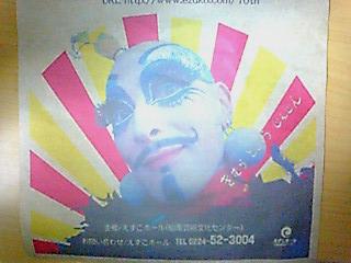 (えずこホールwebサイトより抜粋) 十周年記念事業・住民参加型総合音楽劇 「十年音泉」の開催に併せ実施する総合 音楽劇屋台プロジェクト「えずこ野点」。 陶芸家のきむらとしろうじんじんによる 移動式カフェ(お茶&楽焼屋台、絵付 屋台)を使った屋外でのお茶会です。 焚火屋台やこたつ屋台で身体の芯まで 温まりながら過ごすスペシャルなアート イベント。 自分で絵付けした焼きたてのお茶碗で 抹茶を楽しむ贅沢な時間をゆっくりと お過ごしください。 とまあ色々書いてあるんですが、 やっぱりこれが一番インパクトが あったわけで。。。 いかがでしょう?w 実はこの方に某お店でたまたま お会いしたんです♪ いや、もうね・・・格好もそうですが キャラも濃い方でしたよw クリアな画像が見たい方は下記の リンクより→関連企画→えずこ野点 とクリックしてみてね^^ ■えずこホールwebサイト http://www.ezuko.com/ 興味を持たれた方はぜひぜひイベント 参加して盛り上げちゃってください☆ 日時: 2/14(水) JR大河原駅前広場にて 2/17(土) えずこホール庭園にて 2/18(日) えずこホール庭園にて 参加料: ・絵付けワークショップの場合 1人1500円(お茶碗1個付) ・カフェ利用の場合 抹茶1杯300円 詳細: ■えずこホールwebサイト http://www.ezuko.com/ PR